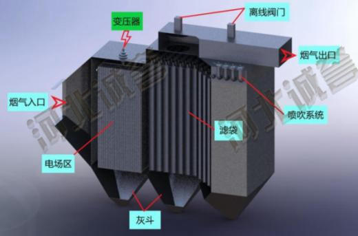 粉塵在電場中充分荷電除去粒徑較大的粗塵,剩下荷電不充分但可在電場中被極化的粉塵進入濾袋除塵,濾袋對微細粉塵有很高的除塵效率。此法結合各種除塵機理,使不同粒徑粉塵達到收集效果。