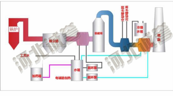 在MGGH基礎之上,在脫硫塔出口增設煙氣冷凝系統對煙氣直接降溫,使飽和煙氣中水蒸汽冷凝并在煙道中捕集下來,收集的冷凝水,進行簡單處理后即可進入FGD系統使用。冷源:江、河、湖、海水等自然冷源,循環冷卻水,強制通風冷卻塔。